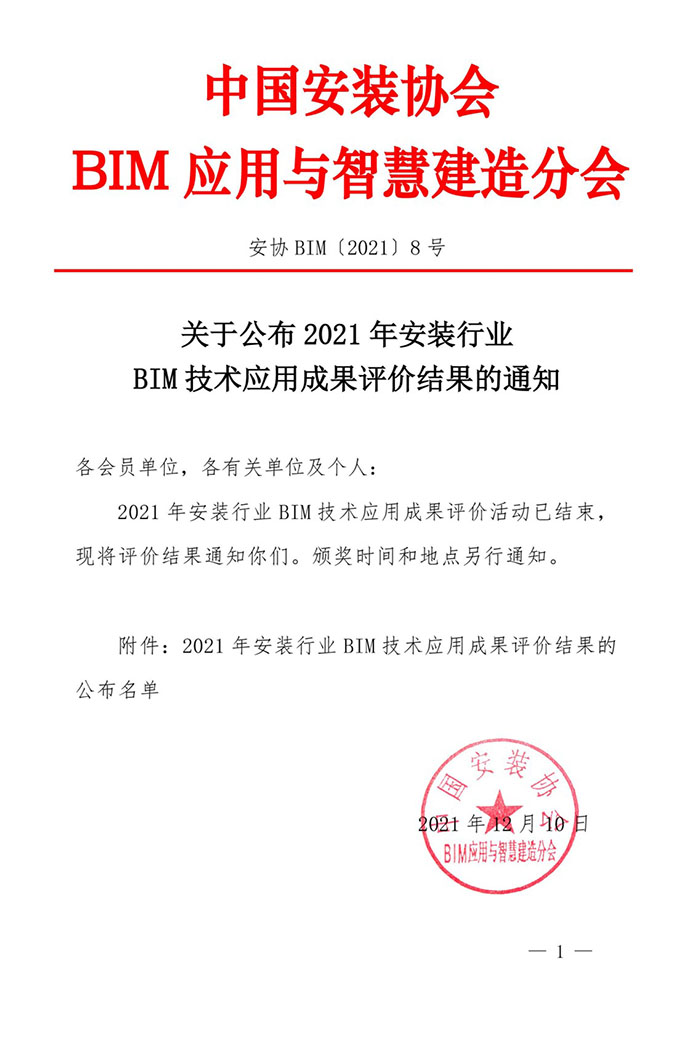 近日,中国安装协会发布了《关于公布2021年安装行业BIM技术应用成果评价结果的通知》。公司两个应用成果经专家评审、终评答辩和公示等环节,最终获得I类成果1项、II类成果1项的优异成绩,达近年来最好水平。